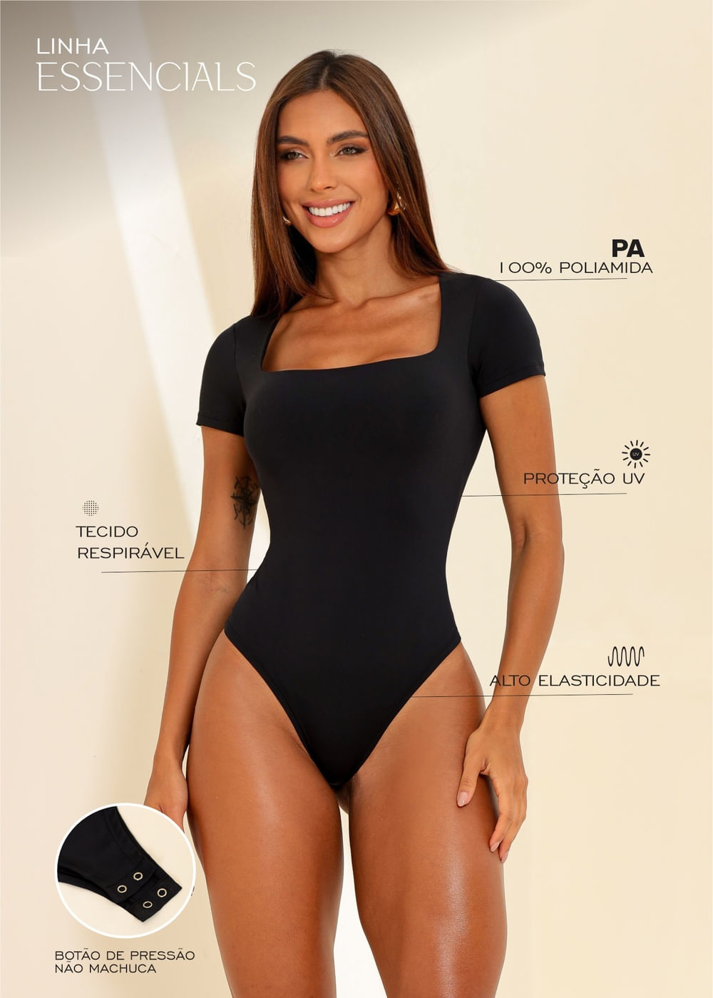 Body Basic Decote Quadrado Poliamida Premium Preto - PRETO