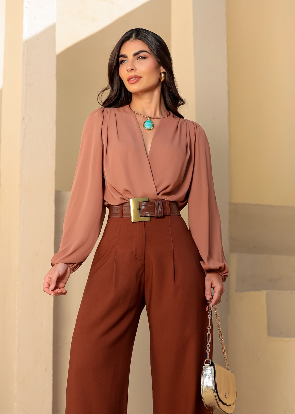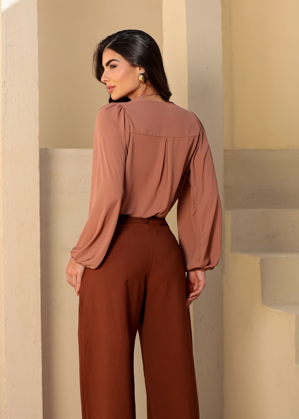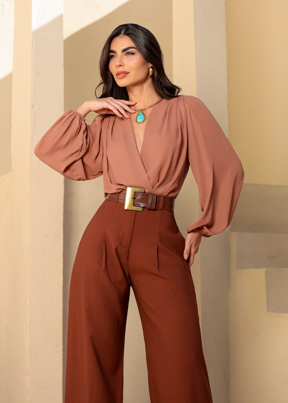 Body Transpassado c/ Manga Bufante - MARROM