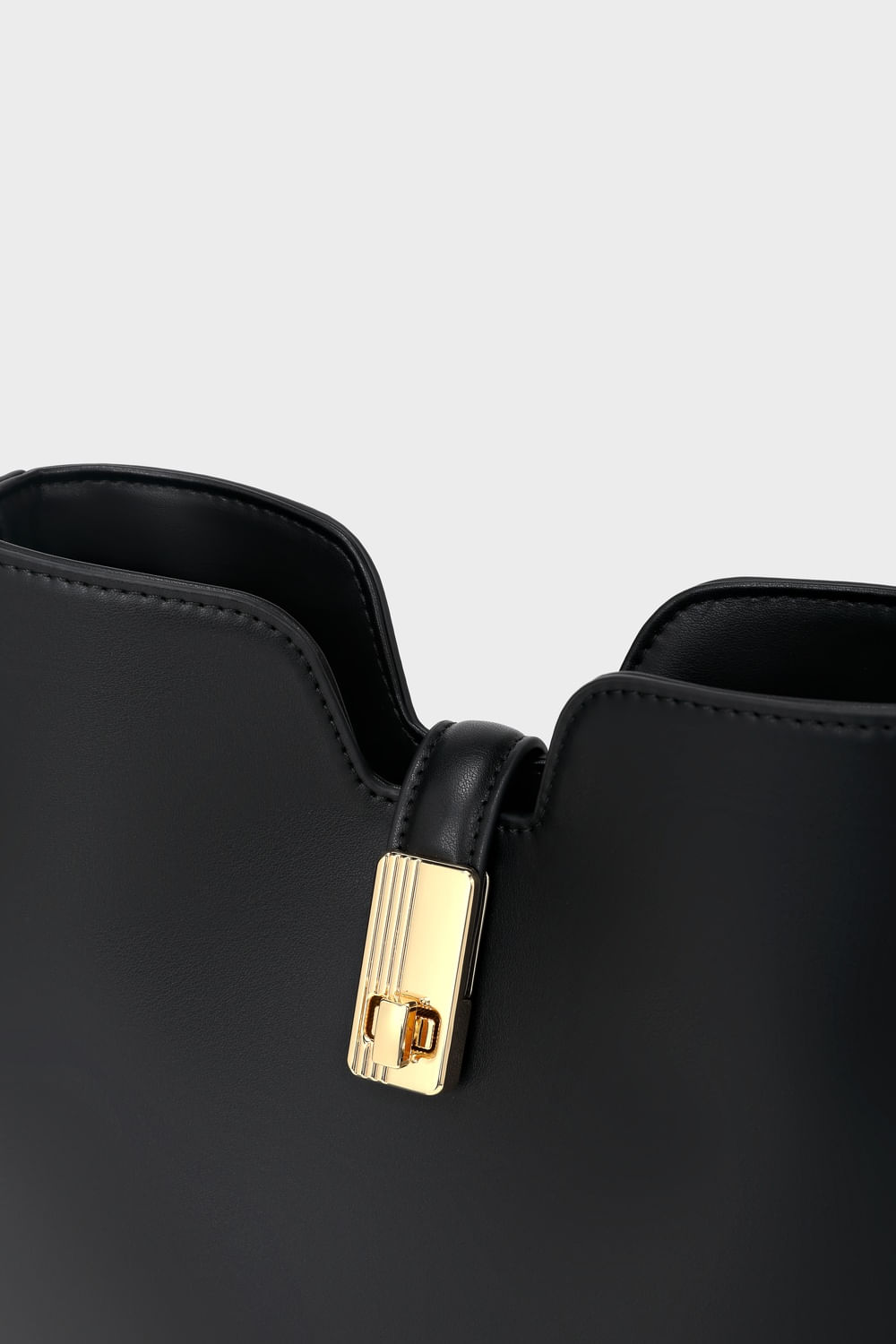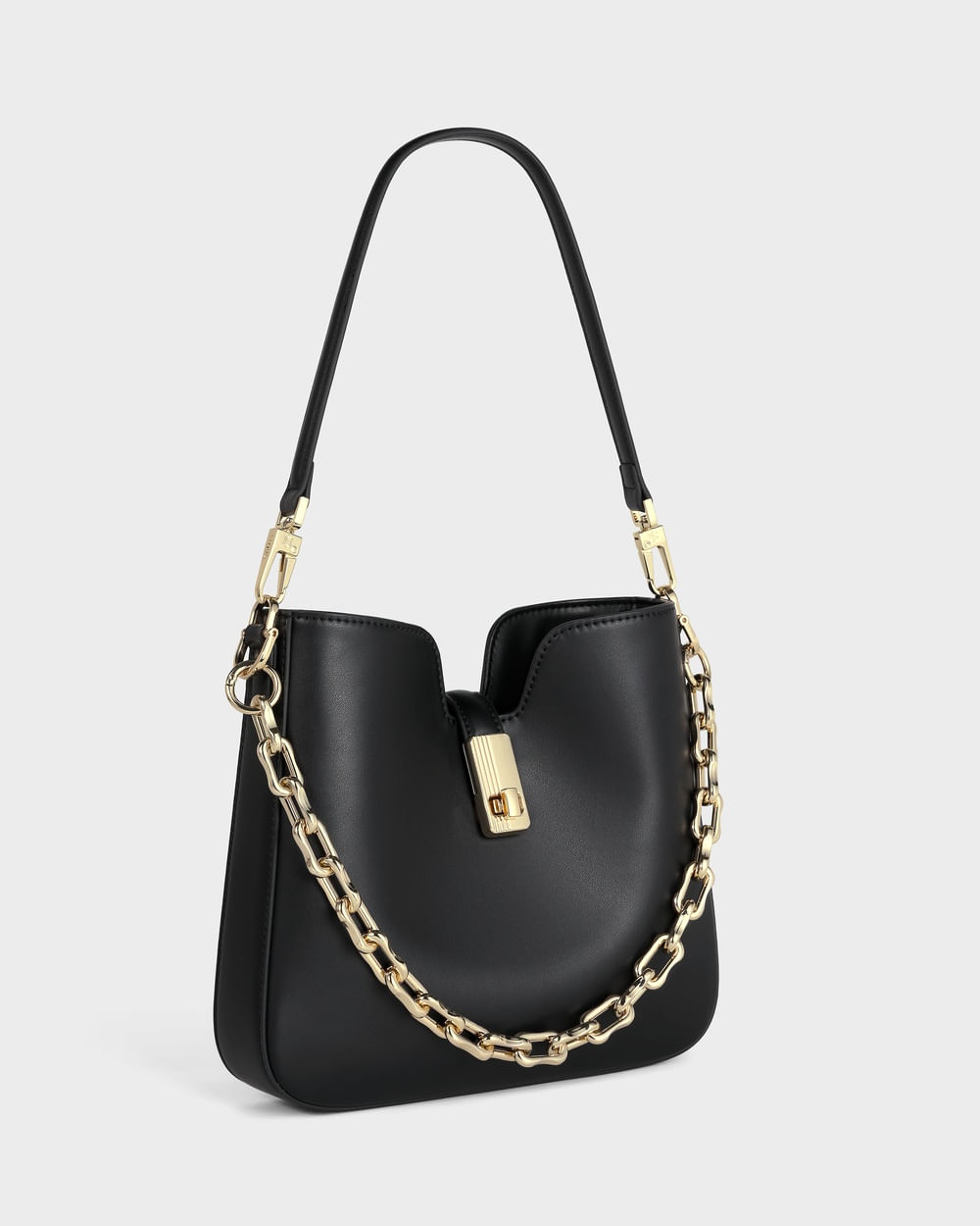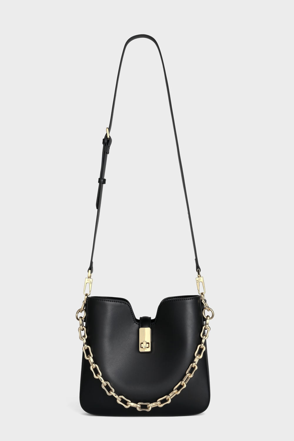 Bolsa com acabamento liso e estrutura levemente arredondada. Possui fechamento frontal com fivela metálica dourada, alça de ombro fixa e corrente decorativa removível que agrega sofisticação ao modelo.