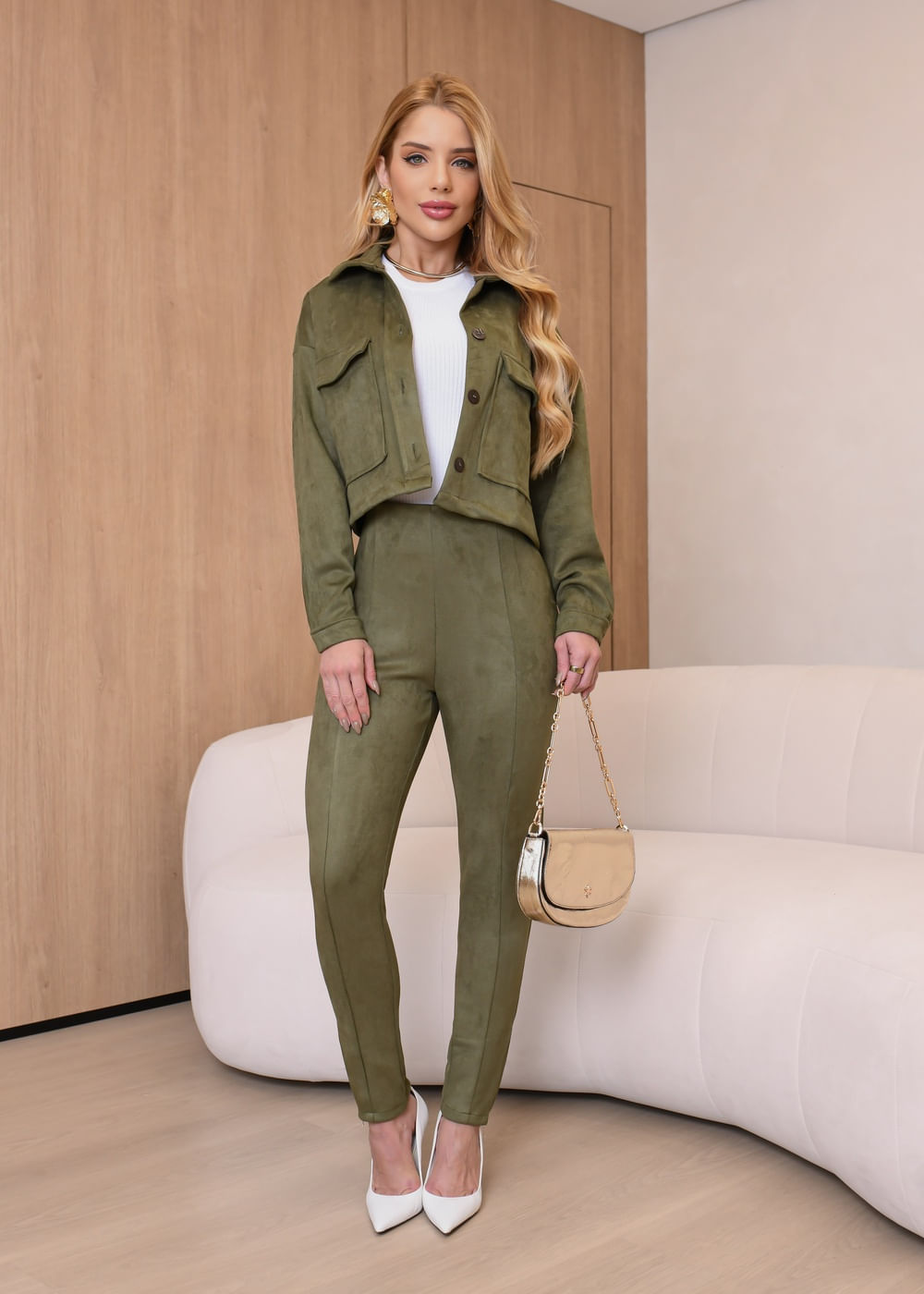 Conjunto Camurça Jaqueta Cropped Camurça c/ Bolsos/ Calça c/ Zíper na Barra - VERDE MILITAR