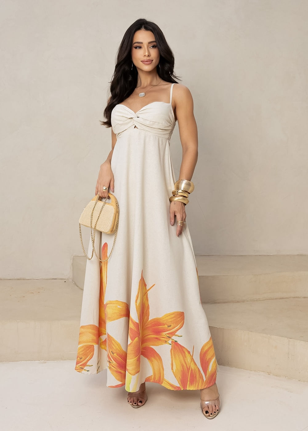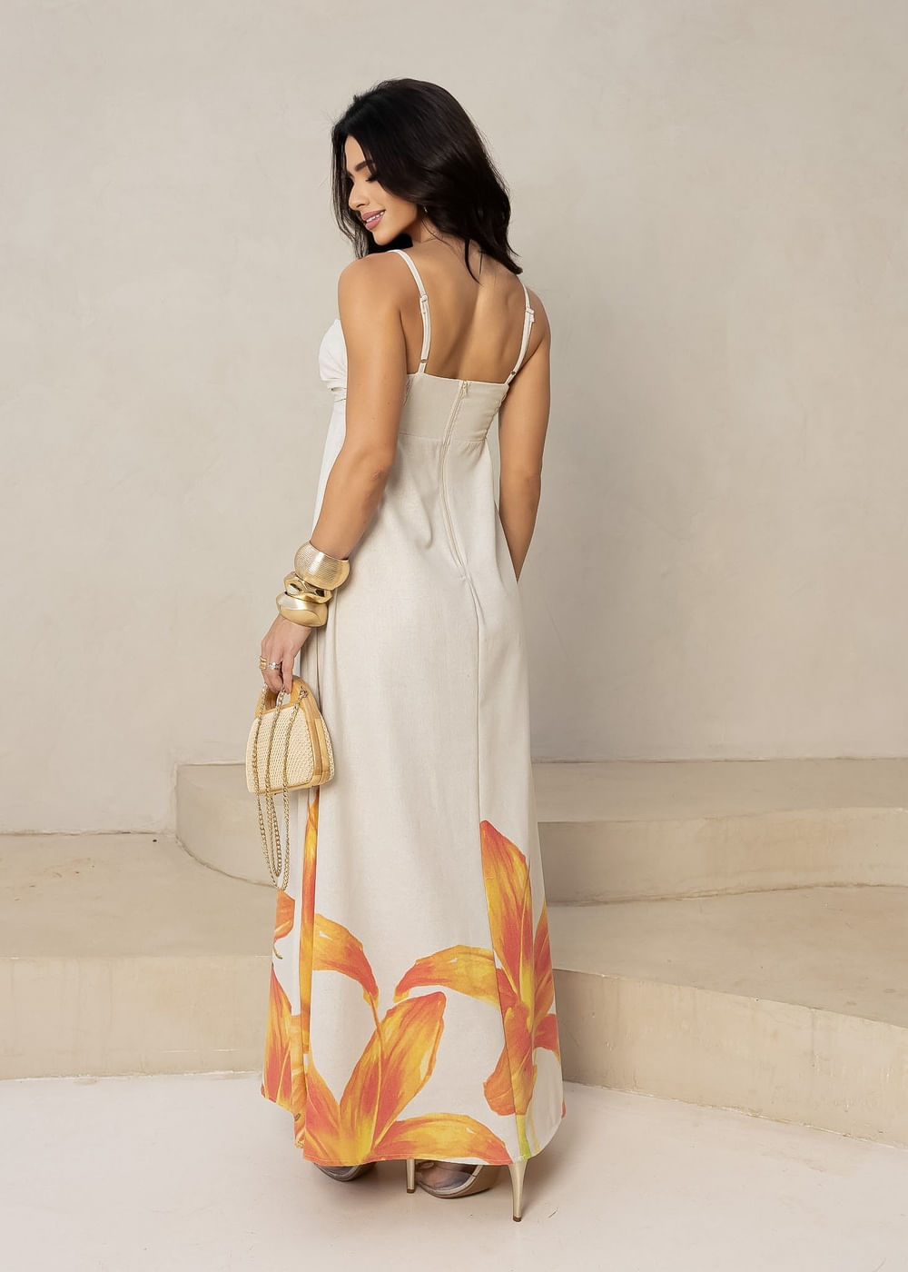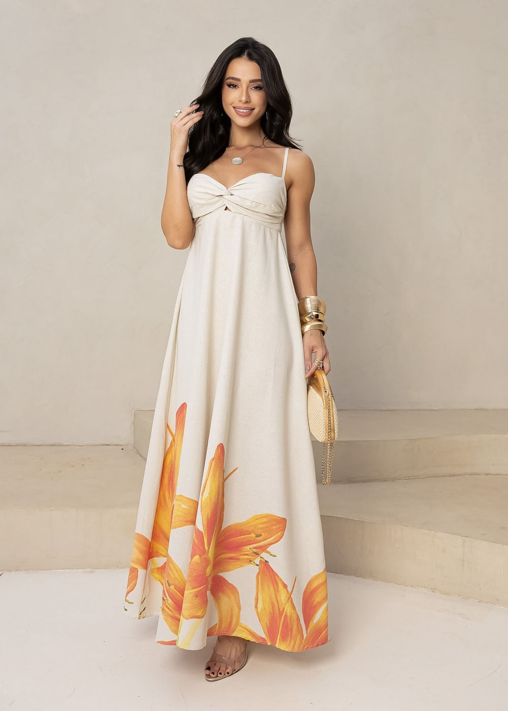 Roupas por categoriaVestidosVestido Longo Floral Lírios Laranja
