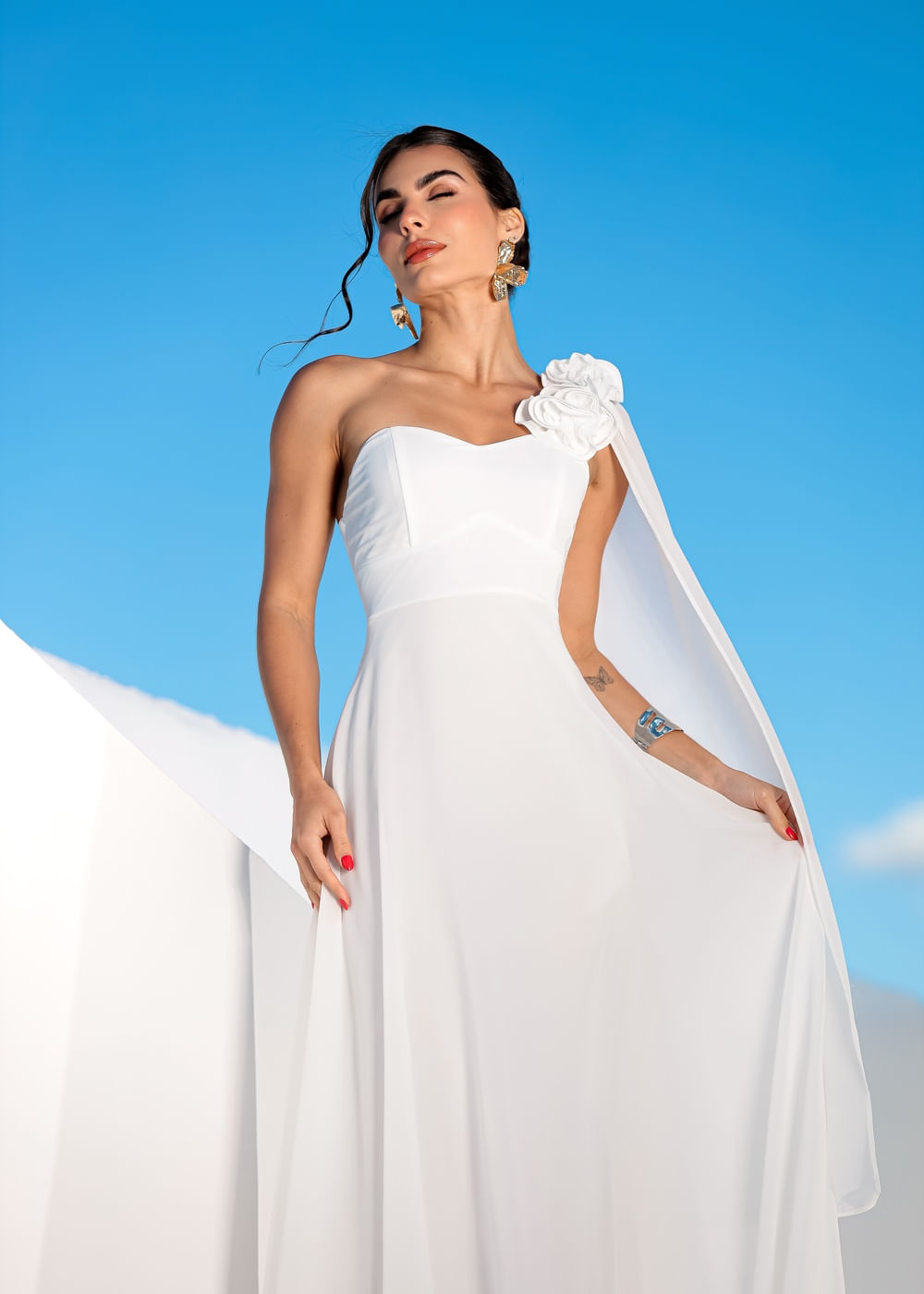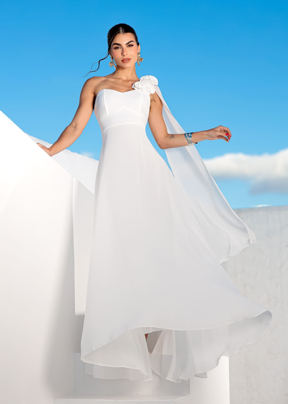 Roupas por categoriaVestidosVestido Longo Musseline Nula Manga c/ Detalhe Floral Branco