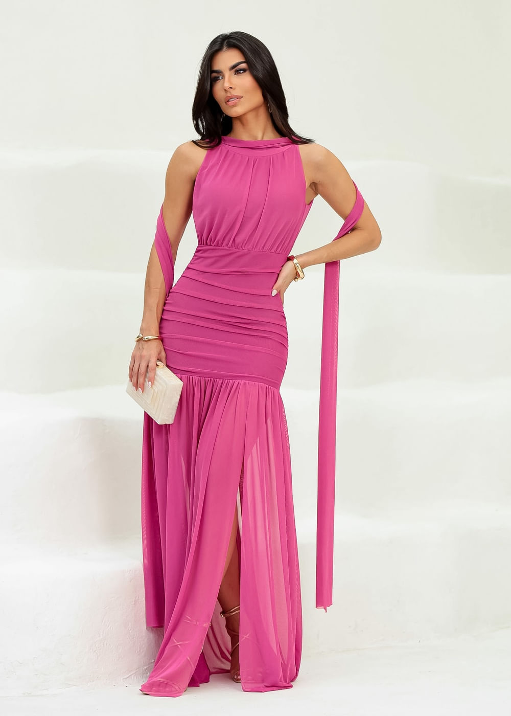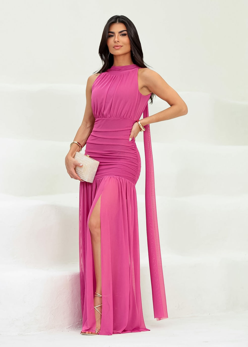 Roupas por categoriaVestidosVestido Longo Plissado de Festa Tule Fúcsia