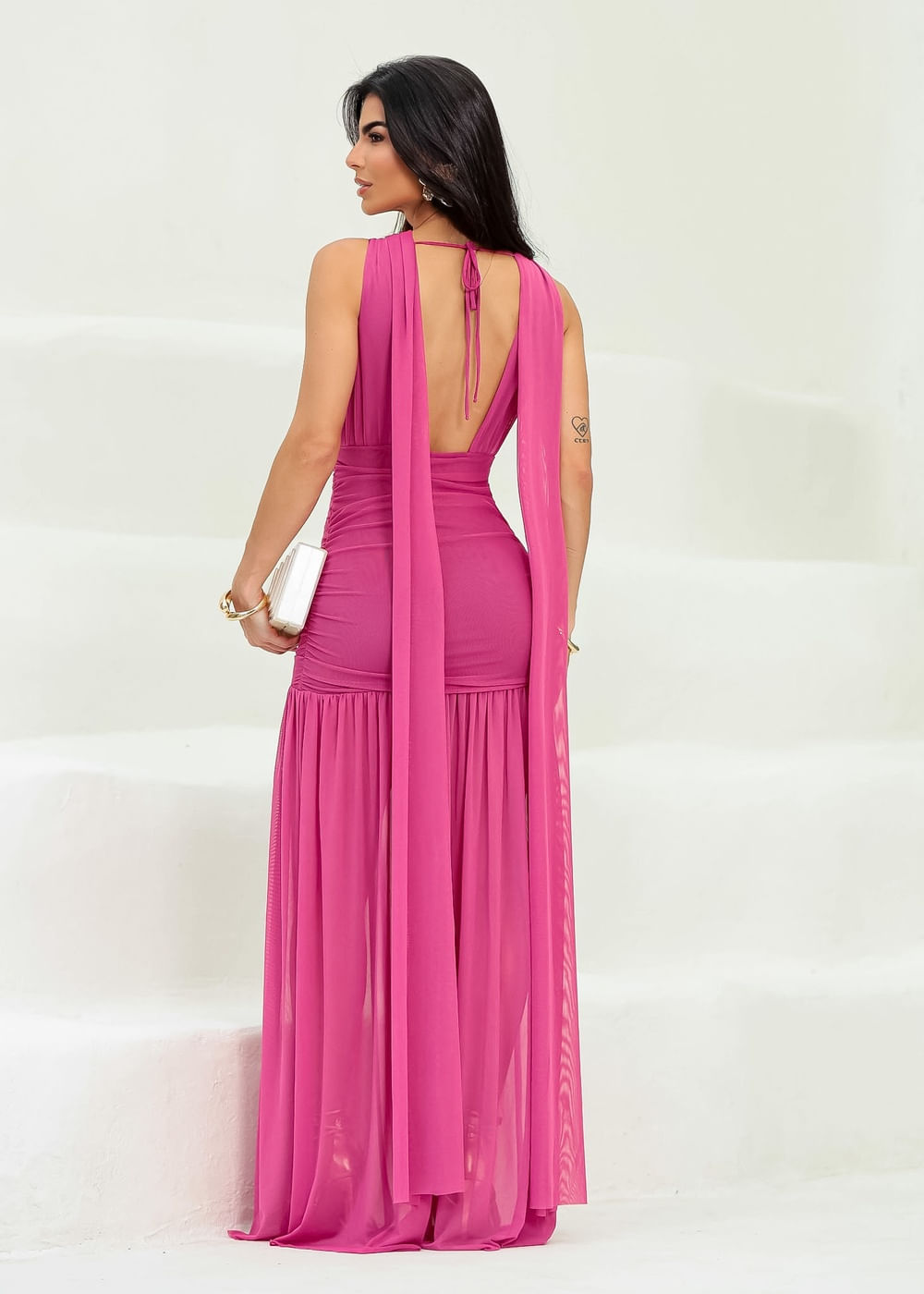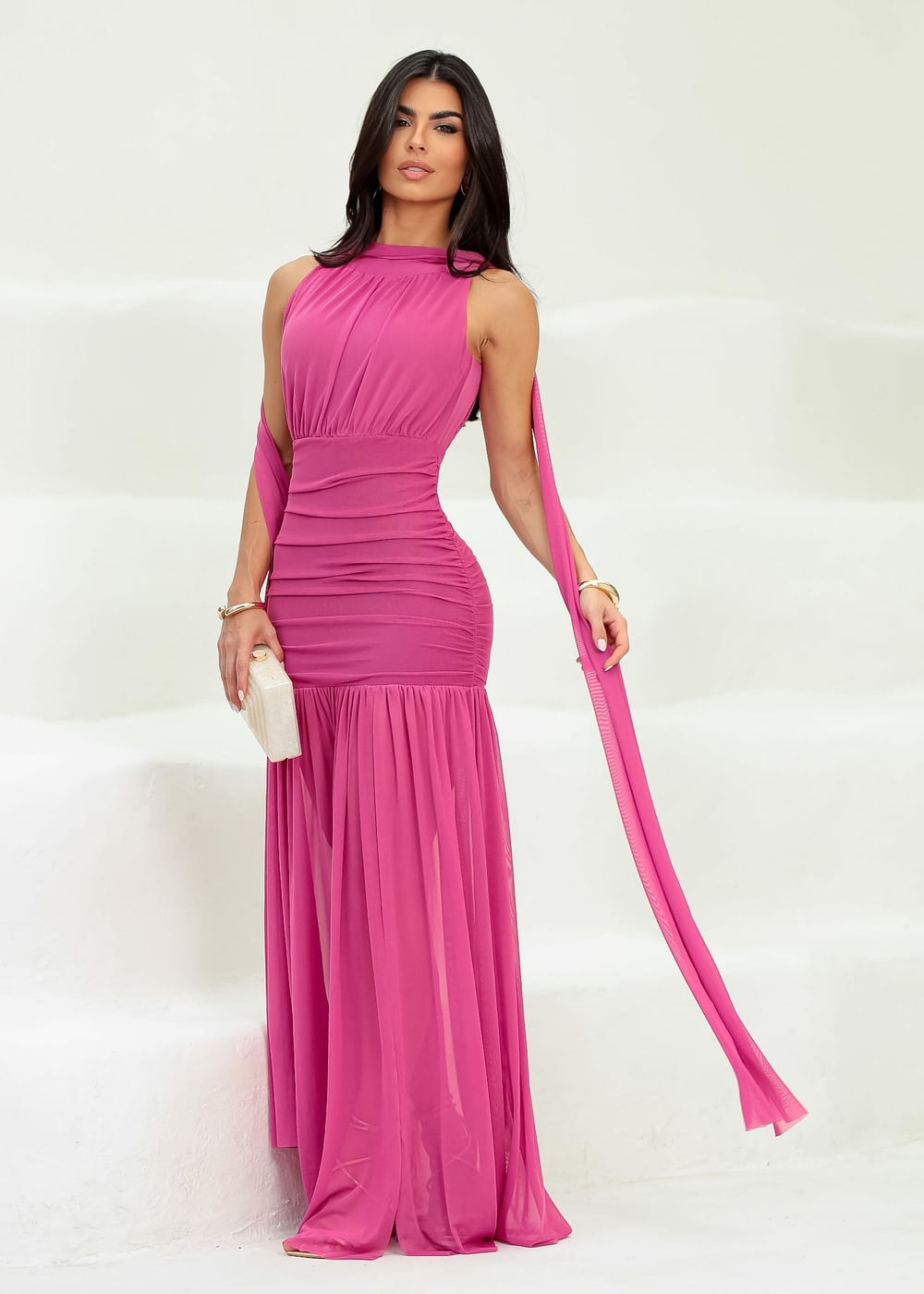 Vestido Longo Plissado de Festa Tule Fúcsia - FÚCSIA
